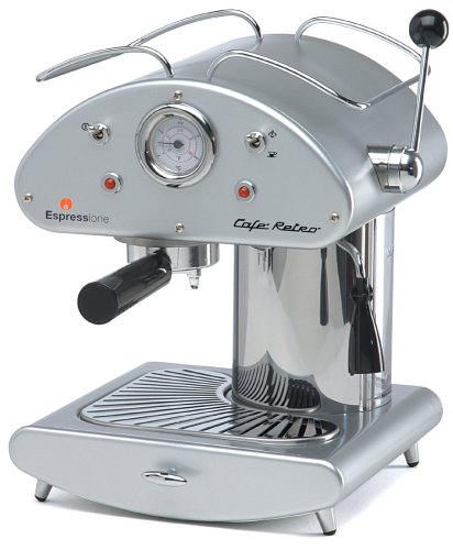 Espressione Café Retro Espresso Machine, Silver. Café Retro is Old World Design with New age features. Steel body with thermo painted metal finish, toggle switches with indicator lights, temperature gauge, sturdy pull down lever for providing commercial quality steaming/frothing, removable tank with water level visible, .7 liter boiler, pull out knock box and cup warmer. Adaptable for use with ground coffee or coffee servings (ESE).